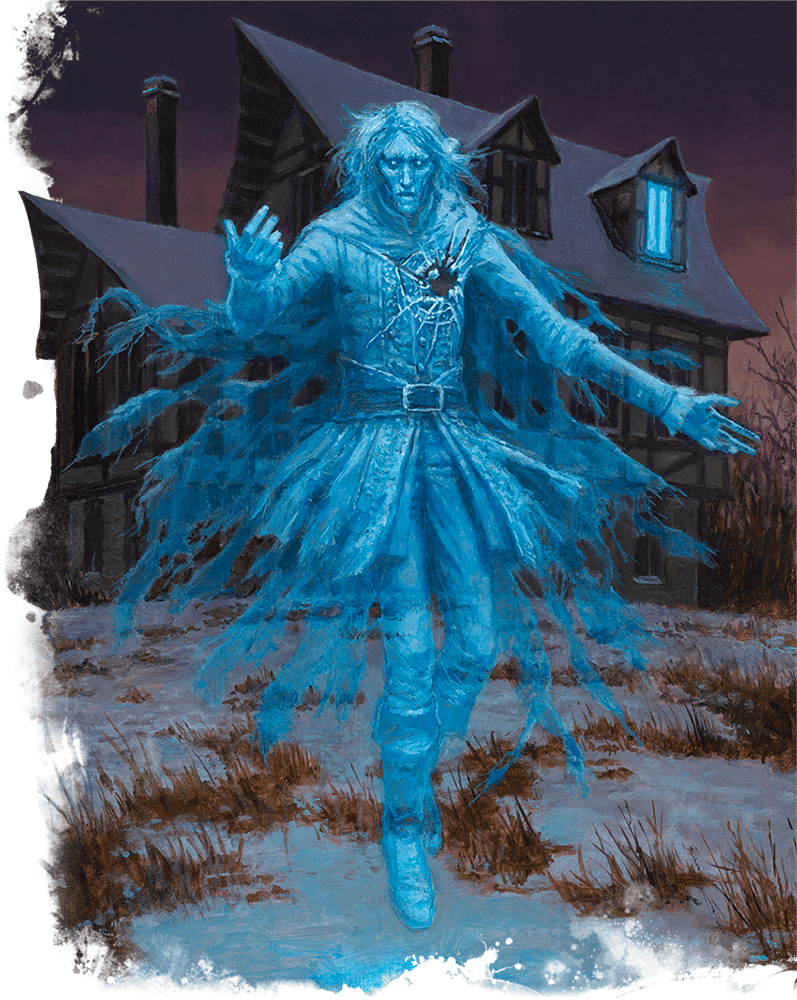 Ghosts arise when living creatures die in a state of extreme emotion or having left an important task undone. These incorporeal spirits haunt locations that are meaningful to them, lingering until their business is complete or they’re put to rest.