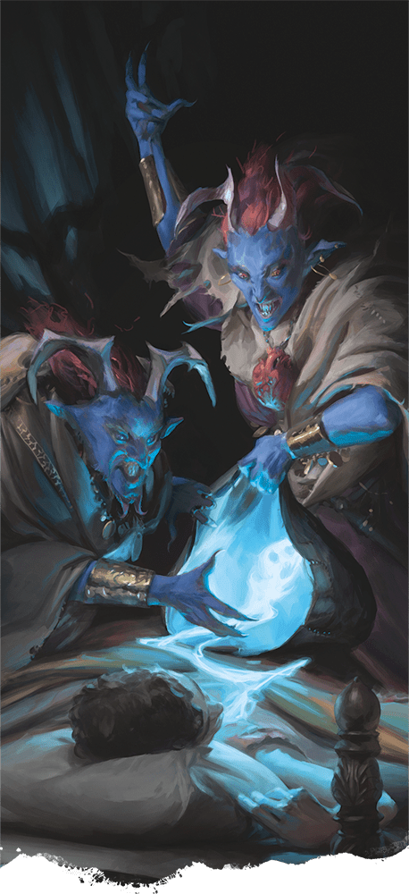 Though night hags resemble withered crones, there is nothing mortal about them. Their withered faces are framed by long, frayed hair and curled ram’s horns; horrid moles and warts dot their blotchy pale-blue skin; and their long, skinny fingers are tipped by claws that can slice open flesh with a touch.
