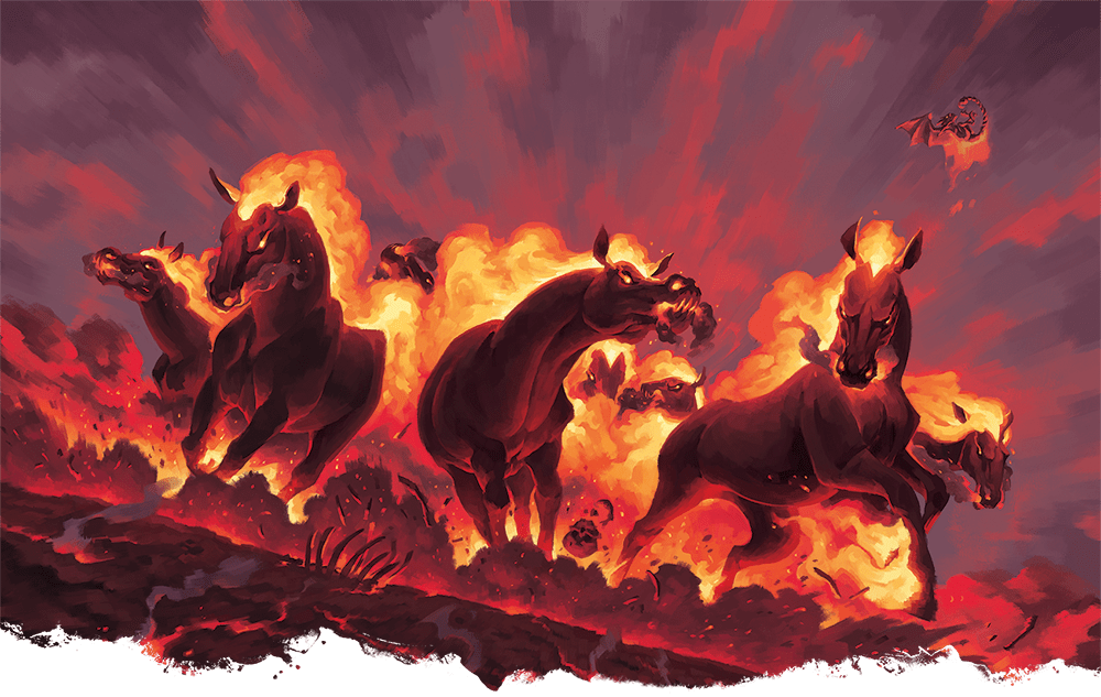 Nightmares resemble horses with flaming manes, burning hooves, and smoldering eyes. They terrorize weaker creatures and often ally with denizens of the Lower Planes in committing evil acts. These supernatural horses can innately travel between the Ethereal Plane and the Material Plane, and many know the locations of portals to the Lower Planes, the Shadowfell, and other sinister realms.