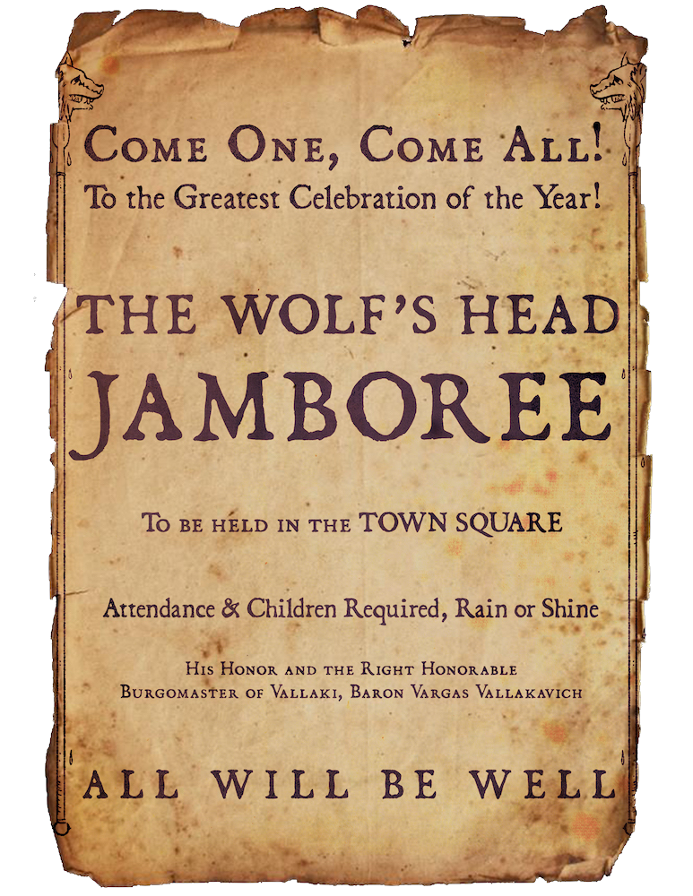 The party selected the wolf-chasing carousel as a suitable gift for Arabelle, made the purchase, and departed the shop. Outside and a little ways down the road in the Town Square, the party observed Izek and several guards putting up posters advertising the coming festival. They noted that there were still plenty of posters for the previous festival (the Wolf’s Head Jamboree), and that the next festival would take place on Neyavr 7. The party didn’t linger, and proceeded to the church.