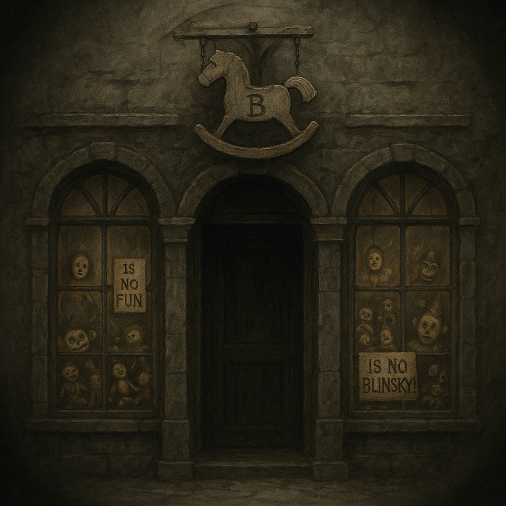 “Wyelcome, friends, to the House of Blinsky, where hyappiness and smiles can be bought at bargain prices. Perhaps you know a leetle child in need of joy? A leetle toy for a girl or boy?”
