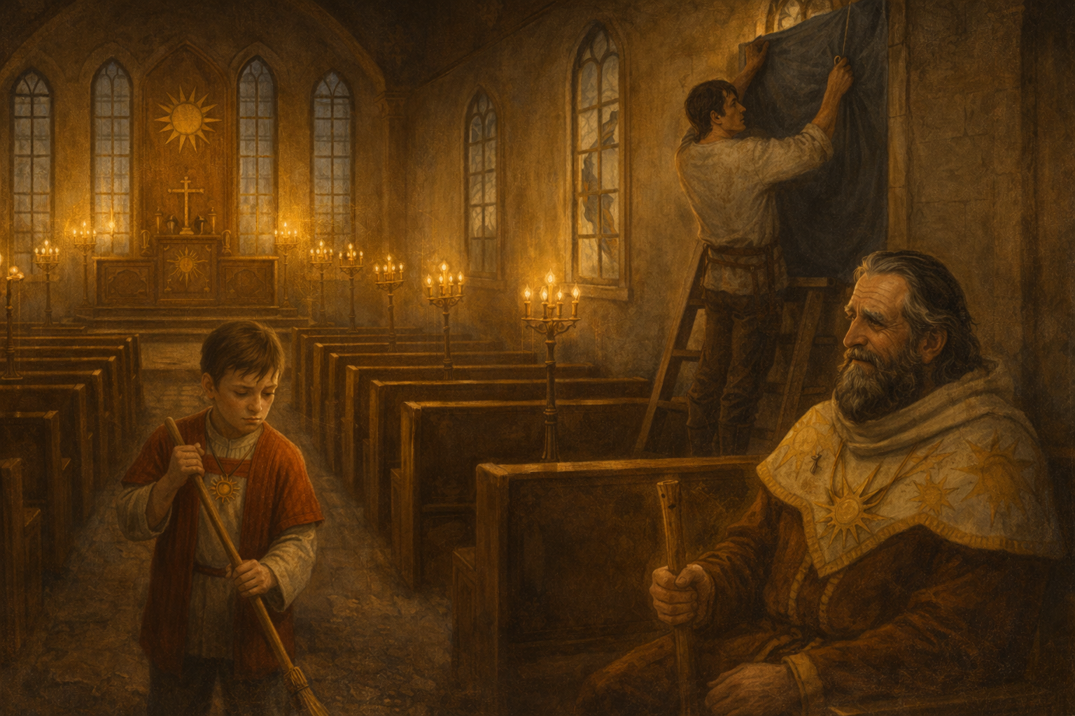 The party entered the chapel to find a broad-shouldered, black-haired young man standing atop a stepladder, nailing a tarp into place over a broken window, while a young boy swept the chapel floor not far away. Father Lucian, in crisp, clean vestments, watched them work from the pews, holding a broom of his own and looking pensively into the distance.